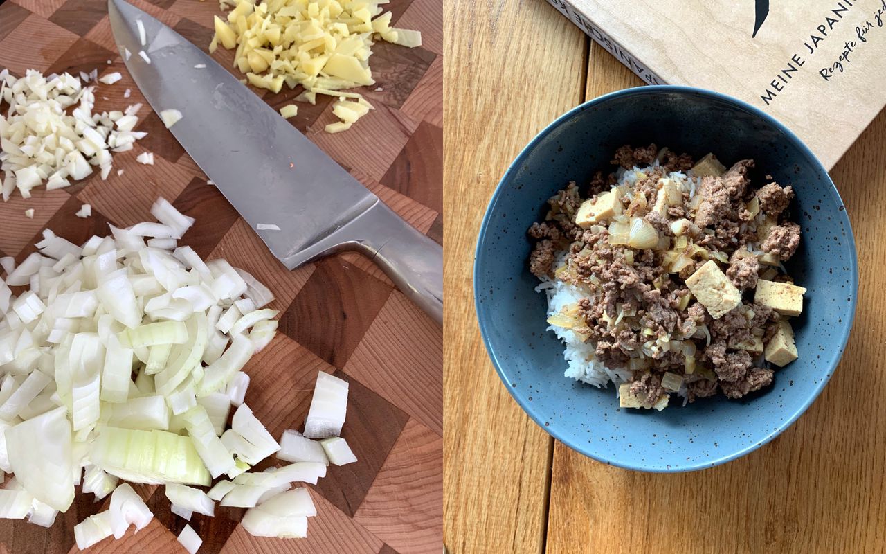 Und natürlich das Essen, zu dem er hervorragend gepasst hat. An warmen Tagen esse ich gerne etwas asiatisches mit ein bisschen Schärfe. Man schwitzt zwar wie ein Schwein, aber irgendwie ist die Hitze danach besser zu ertragen. Ein Lieblingsrezept für solche und auch andere Tage habe ich aus dem großartigen Kochbuch “Meine Japanische Küche” von Stevan Paul: Mabodon. Tofu in Hackfleischsoße mit Ingwer, Knoblauch, Chilisoße, Sojasoße und Miso. Eine Umamibombe mit verschiedenen Texturen. Sicher, nicht das schönste Essen, das man je gesehen hat. Aber unfassbar lecker und schnell gekocht. Zum Essen kommt die Würze im Wein in den Vordergrund, Restzucker und Säure harmonieren perfekt mit dem Umami und der Schärfe, Zitrusfrüchte werden noch kräftiger, man schmeckt Limetten, Grapefruit, einfach toll!