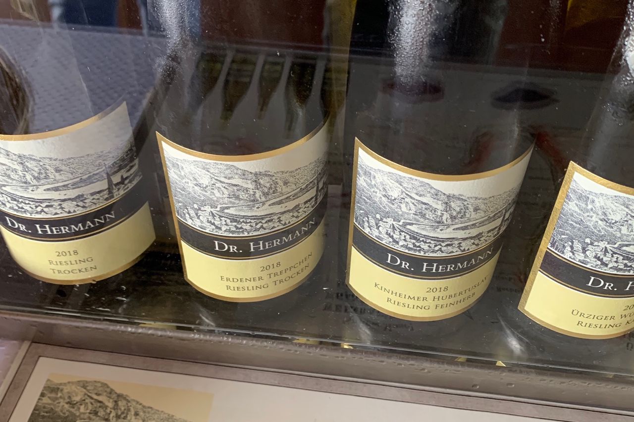 Bei Dr. Hermann haben wir zuerst den 2018er trockenen Basisriesling probiert. Irgendwie war der ein bisschen zu reif, zu melonig in der Nase. Der Rest hat das aber mehr als aufgefangen. 2018 Kinheimer Hubertuslay Feinherb: Birne, gelber Apfel, super saftig mit einer tollen Mineralik. Davon muss was in den Keller. 2018 Ürziger Würzgarten Kabinett: Stinker, super viel Feuerstein in der Nase, im Munde aber sehr runde mit toller Frucht und Würze. 2018 Erdener Herzlei Spätlese von 125 Jahre alten Reben aus Monopollage: Honig, Birne, Holunderblüte, feiner Säure, lang. Super Kollektion!