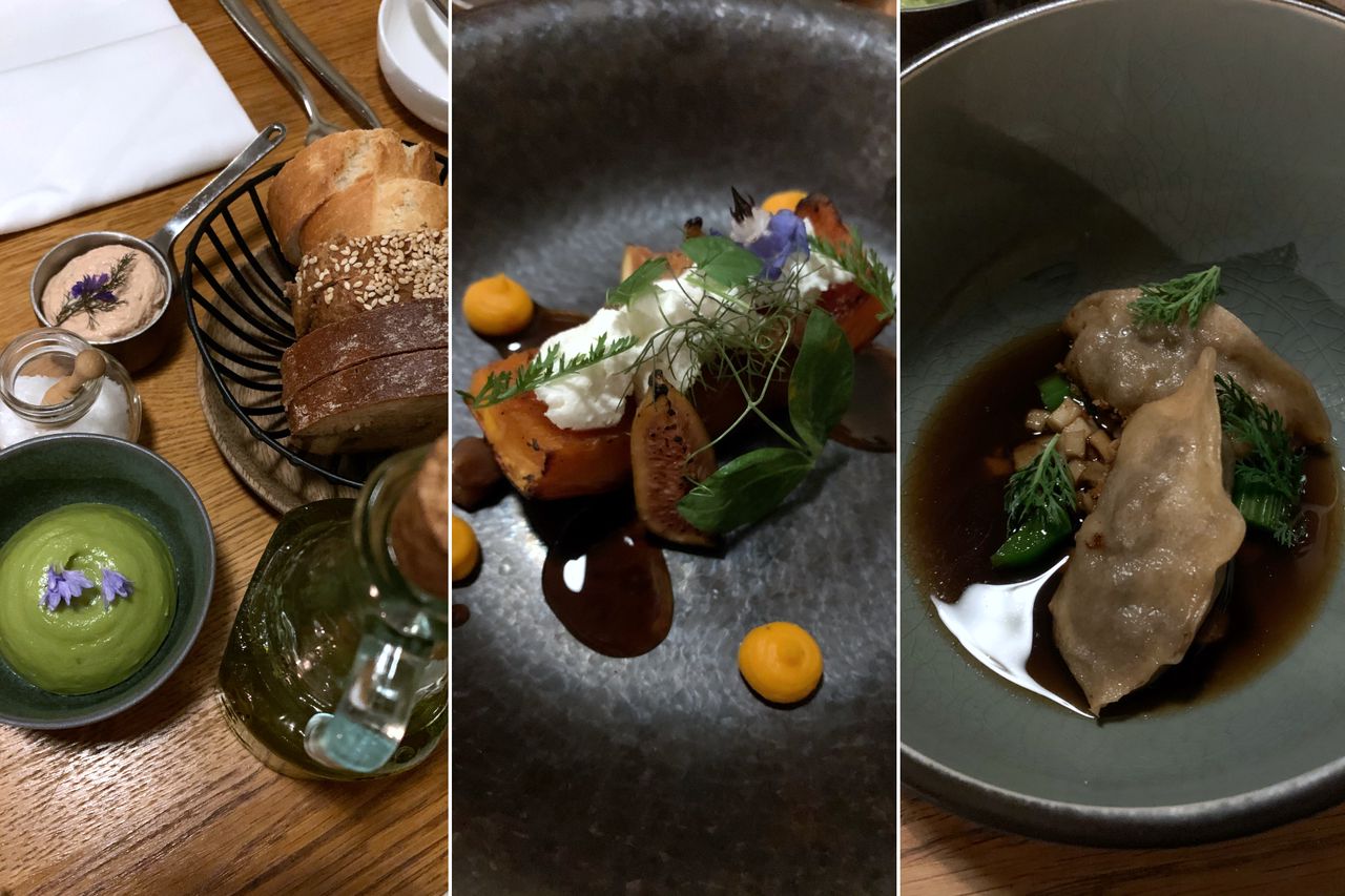 Los ging es mit Brot vom Ulmer Zuckerbäcker, einem Avocadodip, einem Currydip, Meersalz und gutem Olivenöl. Dazu ein Schluck Qvinterra Grauburgunder 2019 von Kühling-Gillot. Ein guter Start in den Abend. Weiter mit dem ersten richtigen Gang des Menüs: Eine toll gegarte Spalte Kürbis mit wunderbar cremigem Pürée, Ziegenfrischkäse, geflämmten Feigen und einem Lack auf Sojasoßen-Basis. Viel Umami und erdige Cremigkeit, die vom Frischkäse und den aromatischen Kräutern aufgelockert wurden. Dazu ein Ruppertsberger Riesling von Bassermann-Jordan, der mit Mineralik und frischer Säure gut gepasst hat. Mit dem nächsten Gang kam dann für mich das Highlight des Abends auf den Tisch. Dumplings gefüllt mit super zartem, intensiv schmeckenden Ochsenschwanz, dazu gewürfelte Pilze und gepickelter Sellerie in einem aromatischen Pilzsud. Dazu ein Exceptional Harvest von Ximénez-Spínola, einem halbtrockenen Weißwein aus Sherry-Trauben. Die Kombination des leicht säuerlichen aber knackigem Sellerie, dem auf der Zunge zergehenden Ochsenschwanz, der Umamibombe Pilzsud und dem Wein war unglaublich gut. Chapeau sowohl an die Küche als auch an die Auswahl des Weines. Und wo wir schonmal dabei sind auch gleich an den Service, die Erklärungen zum Essen, zu den Weinen, den Pairings und allem drumrum.
