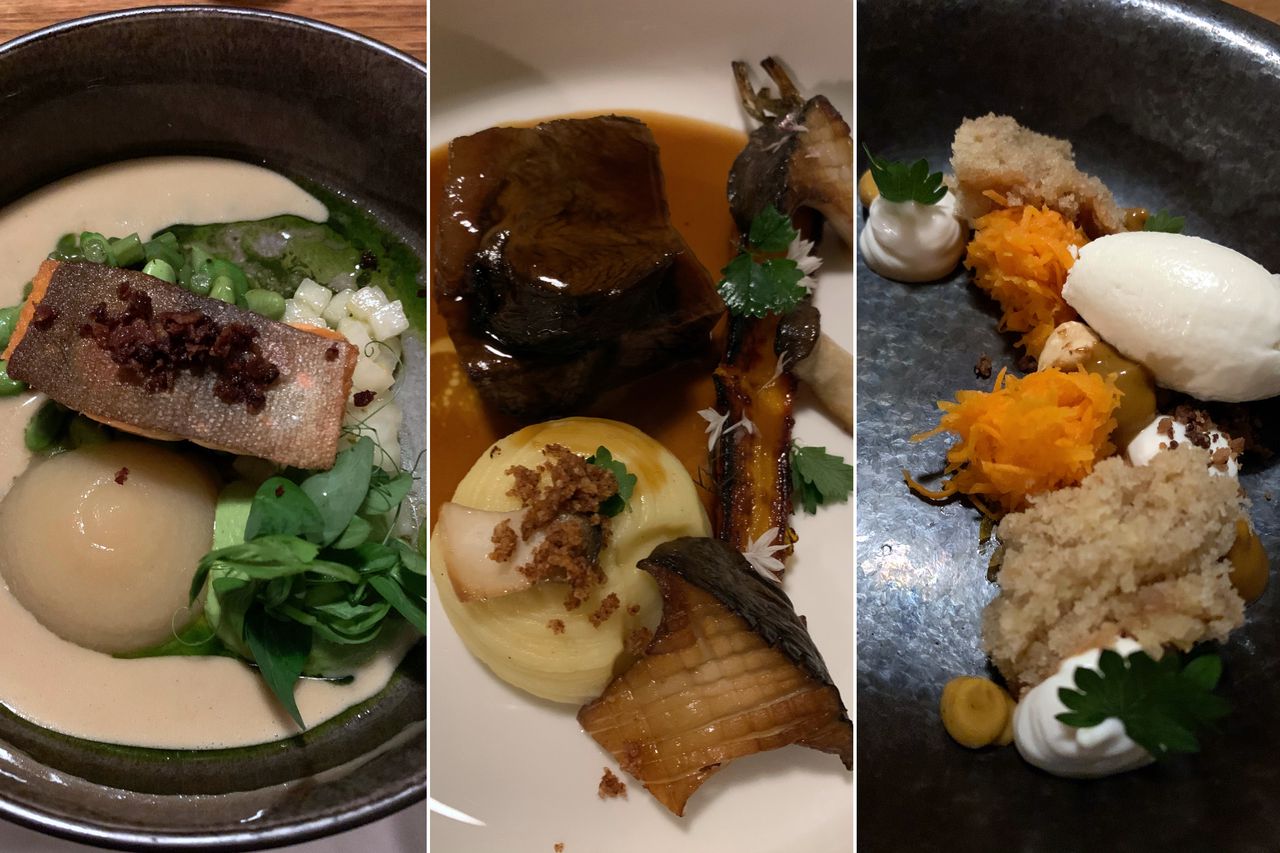 Der mit perfekt krosser Haut gebratene Saibling in Kombination mit Speck, Birnen, Erbsenpüree und Bohnen, der auf den Ochsenschwanz folgte, tut mir dabei fast ein bisschen Leid. Eigentlich war der nämlich auf Augenhöhe mit dem Ochsenschwanz und ähnlich spektakulär. Auch die Weinauswahl, ein Chablis von der Domain de l’Enclos, ein buttriges, gelbfruchtiges Vergnügen, hat super gepasst. Das war so gut, dass ich die Kombination Birne, Speck, Saibling auch selber mal ausprobieren werde. Ich schiebe es ganz auf die geschmackliche Tagesform und bin mir sicher, dass an anderen Tagen dieser Gang die Nase vorne hat. Als Hauptgang wurde butterzart geschmortes Rind in einer aromatischen Jus mit gebratenen Pilzen und einer intensiv röstigen Karotte und Kartoffelpürée serviert. Toll gekocht, aber nicht ganz so beeindruckend wie die beiden vorherigen Gänge. Als Wein gab es einen gereiften Sankt Laurent aus 2008. Der Abschluss hatte es dann aber nochmal in sich. Geraspelte Karotten, gezupfter Kuchen, Sauerrahm, weiße Schokolade, Sanddorn und Haselnüsse. Gefroren, fruchtig, salzig, süß, knusprig, weich, sauer, alles da. Dazu ein Sauvingon Blanc Kabinett von Oliver Zeter. Ein würdiger Abschluss.