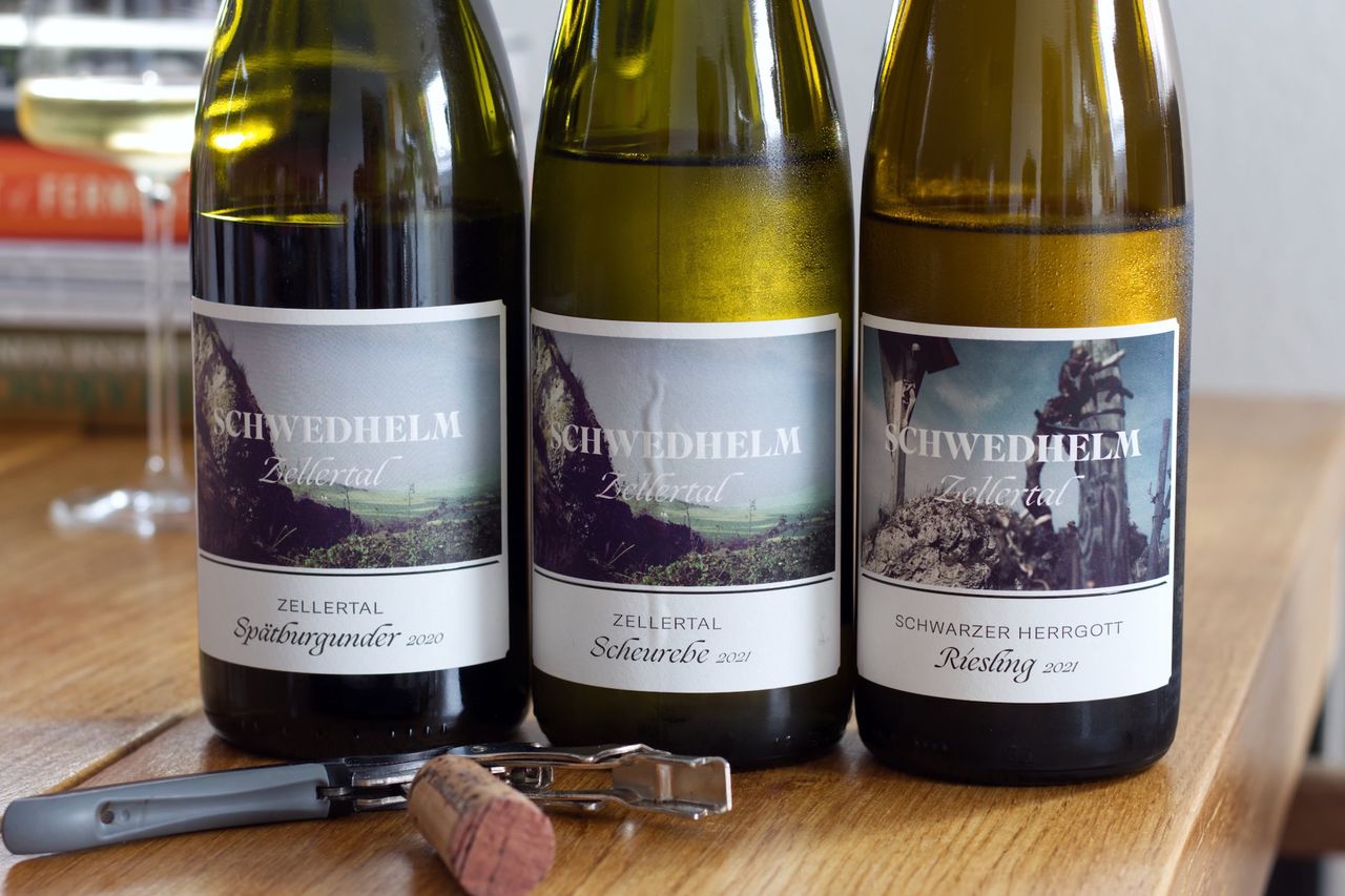 Wir trinken vom Weingut Schwedhelm aus der Pfalz eine Flasche Zellertal Scheurebe 2021, eine Flasche Riesling Schwarzer Herrgott 2021 und eine Flasche Zellertal Spätburgunder 2020.
