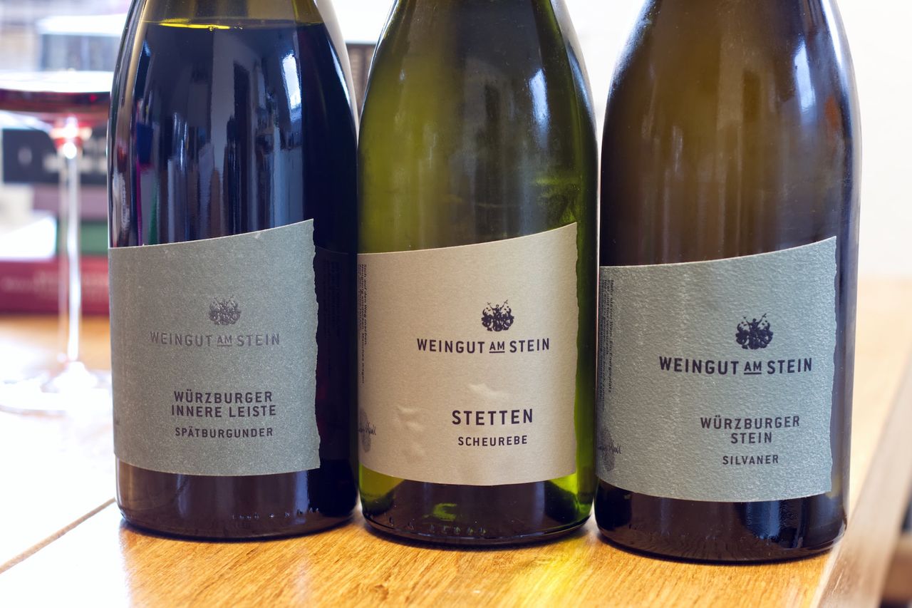 Wir trinken vom Weingut Am Stein eine Flasche Scheurebe Stetten 2021, eine Flasche Silvaner Würzburger Stein 2020 und eine Flasche Spätburgunder Würzburger Innere Leiste 2018.