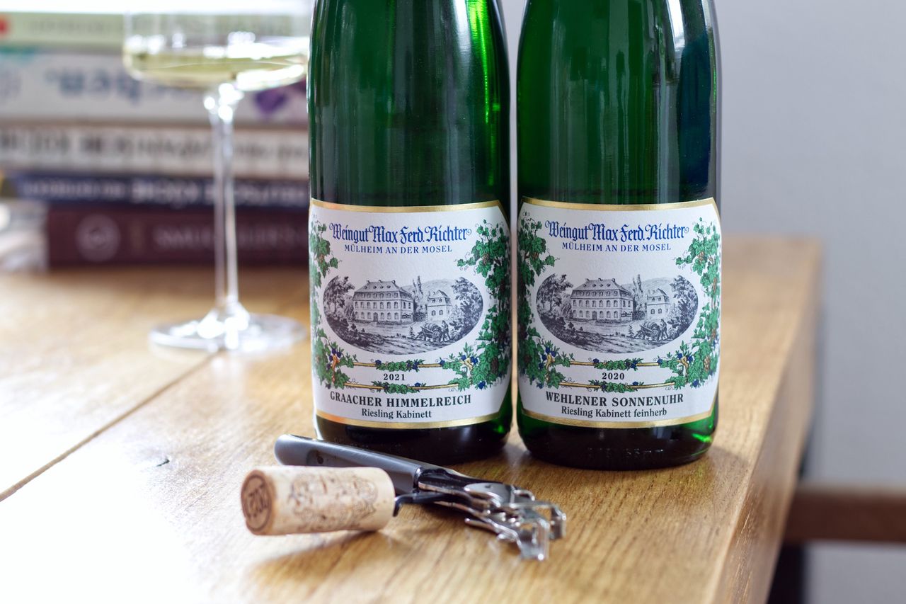 Wir trinken vom Weingut Max Ferd. Richter eine Flasche Graacher Himmelreich Kabinett 2021 und eine Flasche Wehlener Sonnenuhr Kabinett Feinherb 2020.