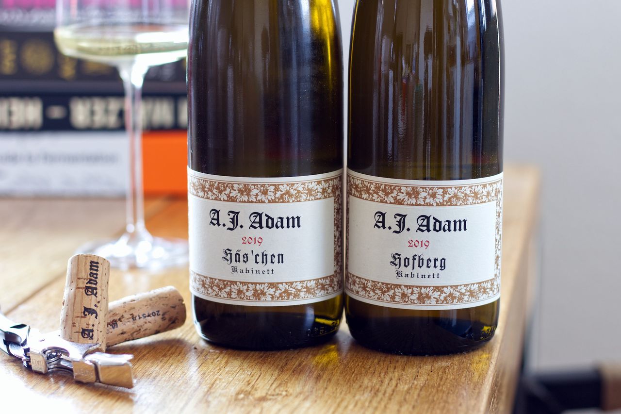 Wir trinken zwei Flaschen Kabinett vom Weingut A.J. Adam: Eine Flasche Hofberg und eine Flasche Häs'chen, jeweils Jahrgang 2019.