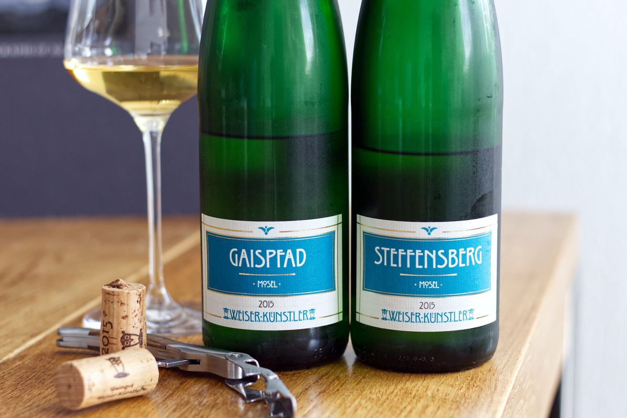 Wir trinken zwei Rieslinge von der Mosel vom Weingut Weiser-Künstler: Einen Steffensberg und einen Gaispfad, jeweils aus 2015