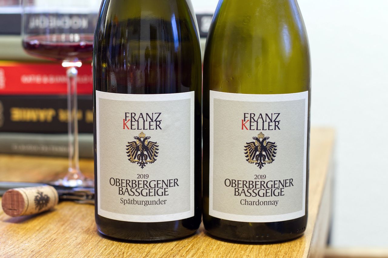 Wir trinken vom Kaiserstuhl eine Flasche Chardonnay und eine Flasche Spätburgunder 2019 aus der Lage Oberbergener Bassgeige vom Weingut Franz Keller.