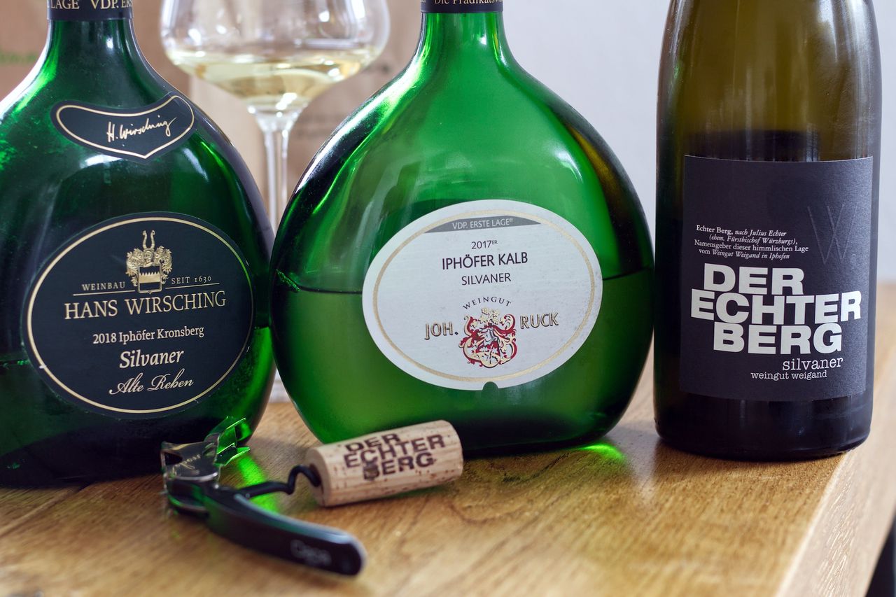 Wir haben drei Silvaner aus Iphofen im Glas: Vom Weingut Hans Wirsching ein Iphöfer Kronsberg 2018, vom Weingut Johann Ruck ein Iphöfer Kalb 2017 und vom Weingut Weigand ein Der Echter Berg aus 2017.
