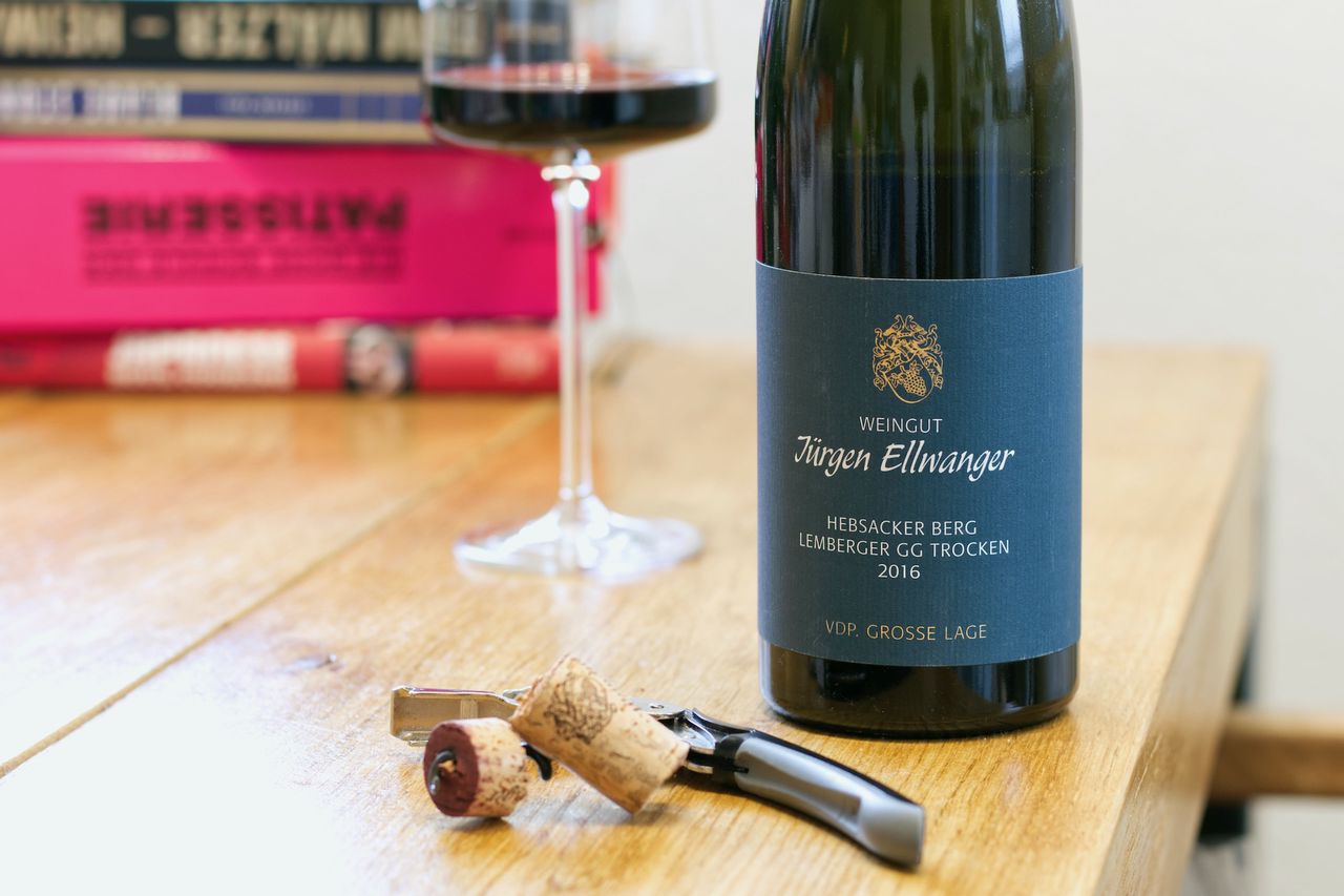 Wir trinken vom Weingut Jürgen Ellwanger eine Flasche Hebsacker Berg Lemberger GG aus 2016.