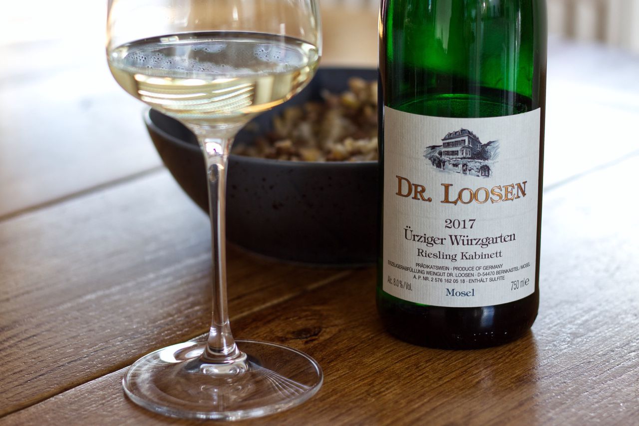 Noch ganz in Mosellaune gibt es einen Ürziger Würzgarten Kabinett aus 2017 von Dr. Loosen. Dazu eine Schüssel Umami.