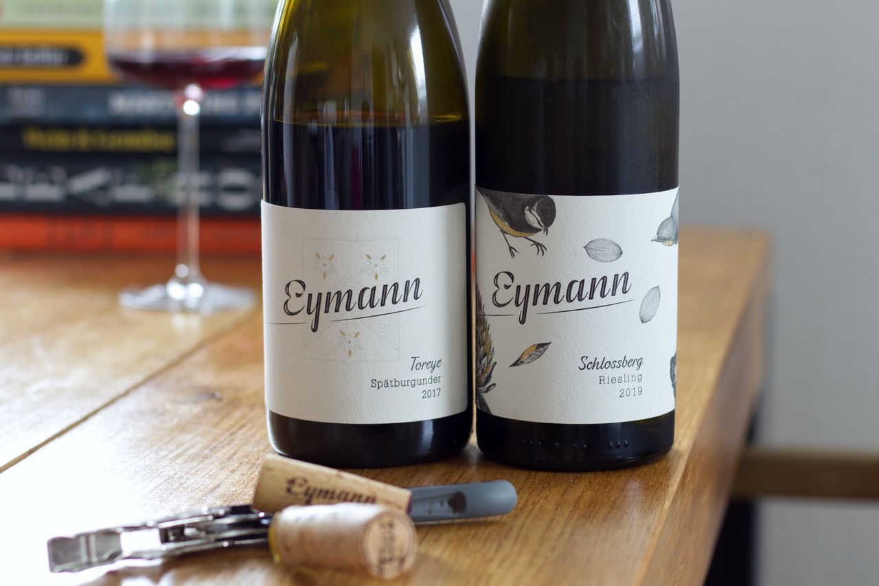 Wir trinken vom Weingut Eymann eine Flasche Toreye Spätburgunder 2017 und einen Riesling Schlossberg 2019.