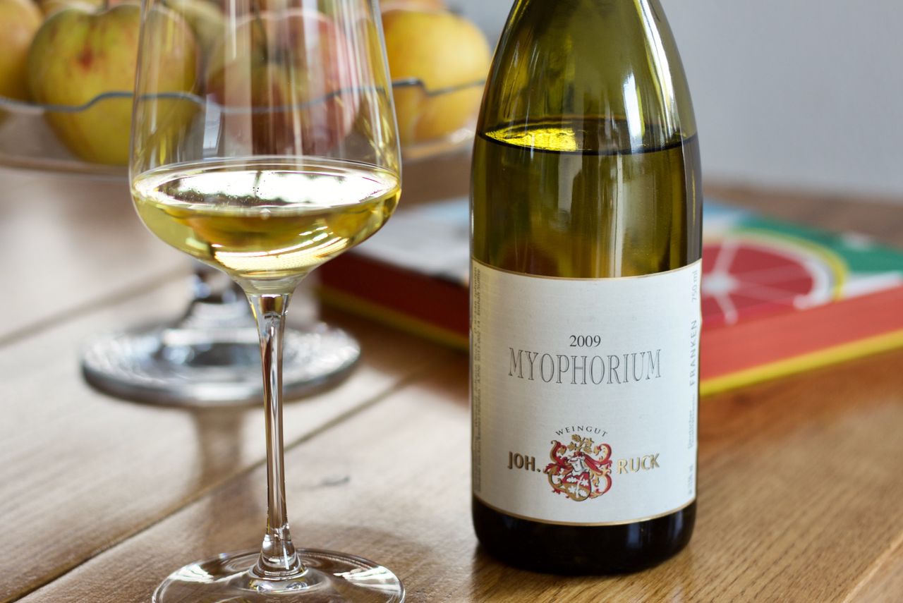 Wir trinken einen Silvaner vom Weingut Johann Ruck aus Iphofen aus dem Jahr 2009, der bis zum Verkauf viel Zeit bekommen hat.